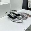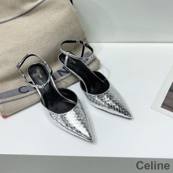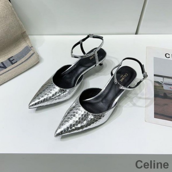 -Silver Celine Kitten Slingback Pumps.