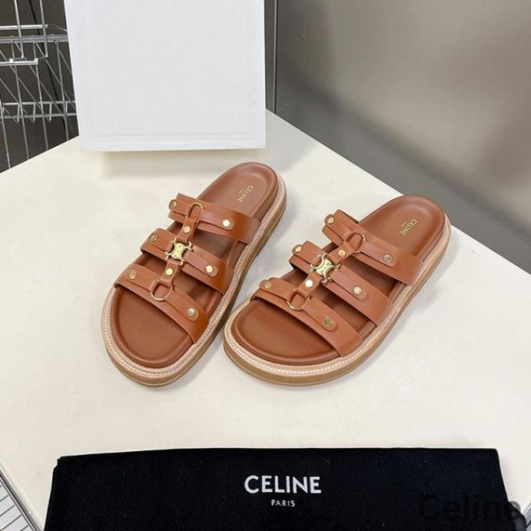 Celine Tippi Platform Slides Women Calfskin with Triomphe Signature Brown